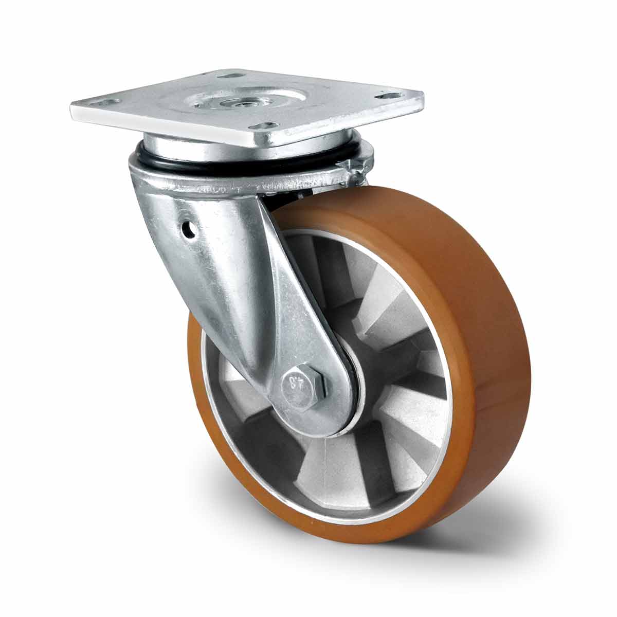 Lenkrolle Schwerlast von Cascoo mit Lauffläche aus Polyurethan braun und Felge aus Aluminium