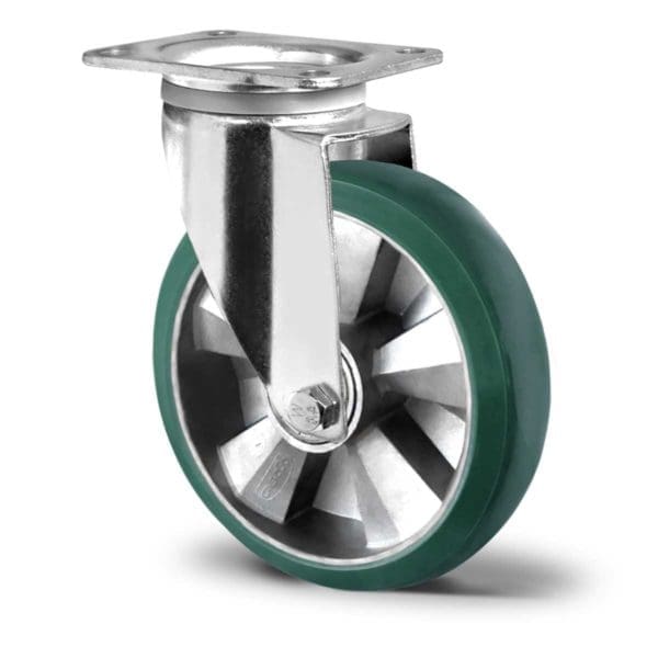 Lenkrolle Schwerlast von Cascoo mit Lauffläche aus PUlastic grün und Felge aus Aluminium