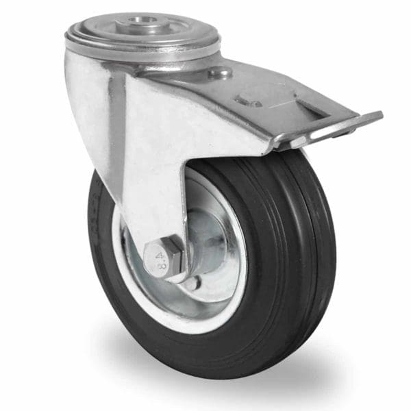 Rückenlochlenkrolle mit Bremse von Cascoo mit Lauffläche aus Vollgummi schwarz und Felge aus Stahlblech